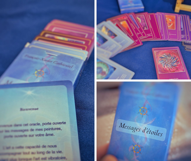Il est né en cherchant un moyen d'expliquer mes peintures aux gens qui me posaient des questions. Ce processus s'est fait sur quasiment une année, entre le choix des cartes, mes messages, les premiers prototypes en tirages photos ....